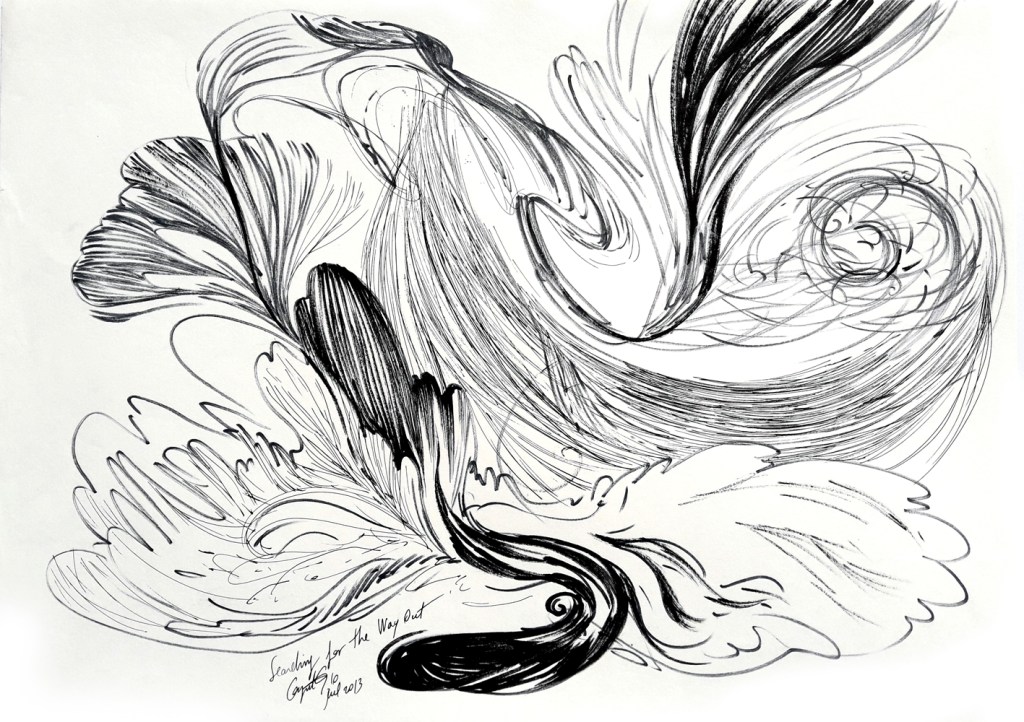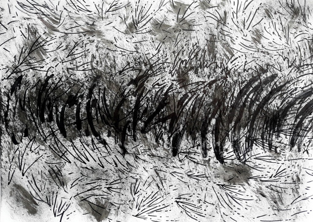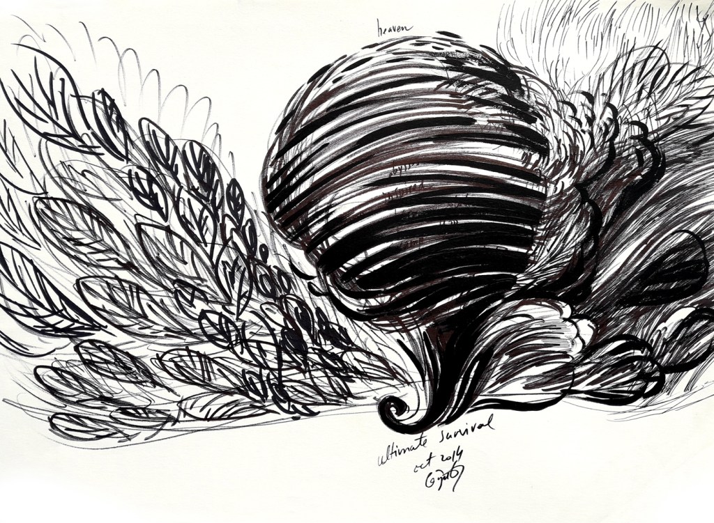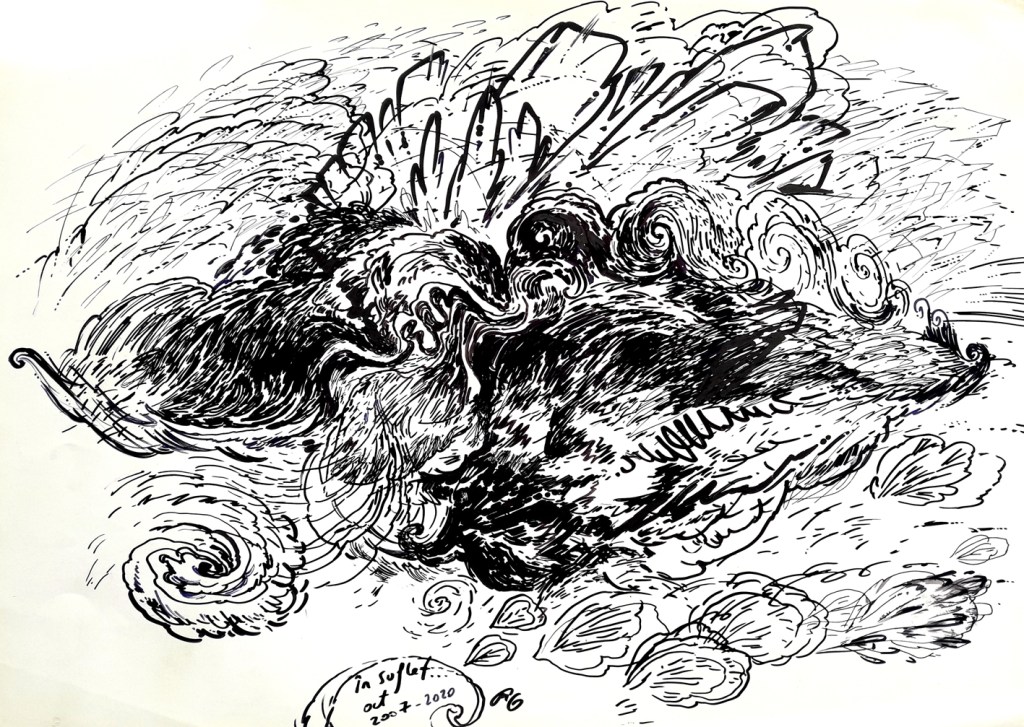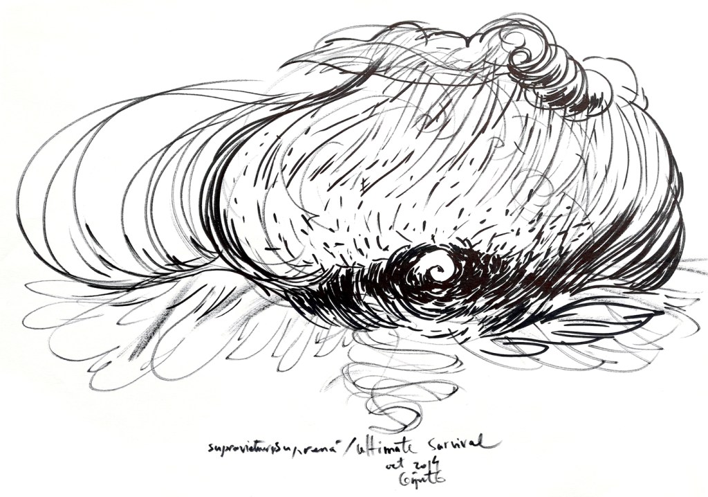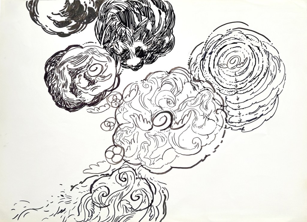 To keep drawing as my only sollution to this passing of time, to survive to the daily thinghs everyone of us must face to, from waking up to going to bed, from birth to death. In these drawings I imagined somekind of radiography, scanning of events, trends, trajectories of facts, thoughts, intentions, expansions of events that cause other events, causes after causes after causes and so on, billions of little thinghs ( you may think of everything… laughs, words, wars, smiles, pandemics, hugs, hurts etc) that, together, create a huge and confuse picture of the present. An impersonal cosmic entity that flows, and flows, eating us, little by little. I have no control of it, just try to expose a very little snapshot of what I think it looks like.